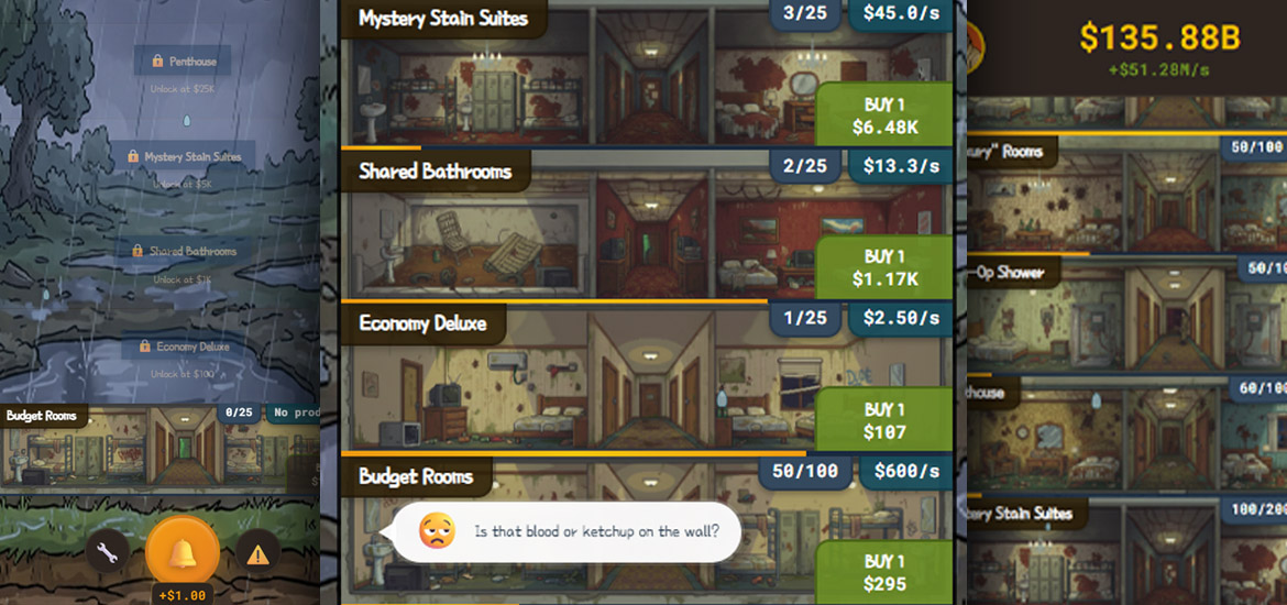 The Garbaggio Hotel is an addictive idle clicker game where you manage and grow your own hotel empire. Start with a single story and tap to generate income, then invest in new rooms and upgrades to trap attract more guests and increase your profits. As you unlock higher floors, you can expand your hotel with (not so) luxury suites, coin-operated showers, and a casino to maximize profits at the expense of others. With simple mechanics and engaging progression, The Garbaggio Hotel offers hours of fun as you build the most profitable (and least comfortable) hotel around.